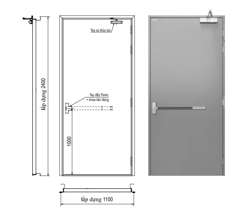 • Vật liệu: Loại thép, kính chống cháy, vật liệu chống cháy bên trong.